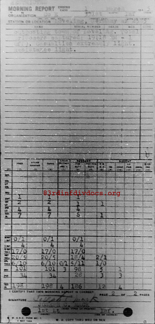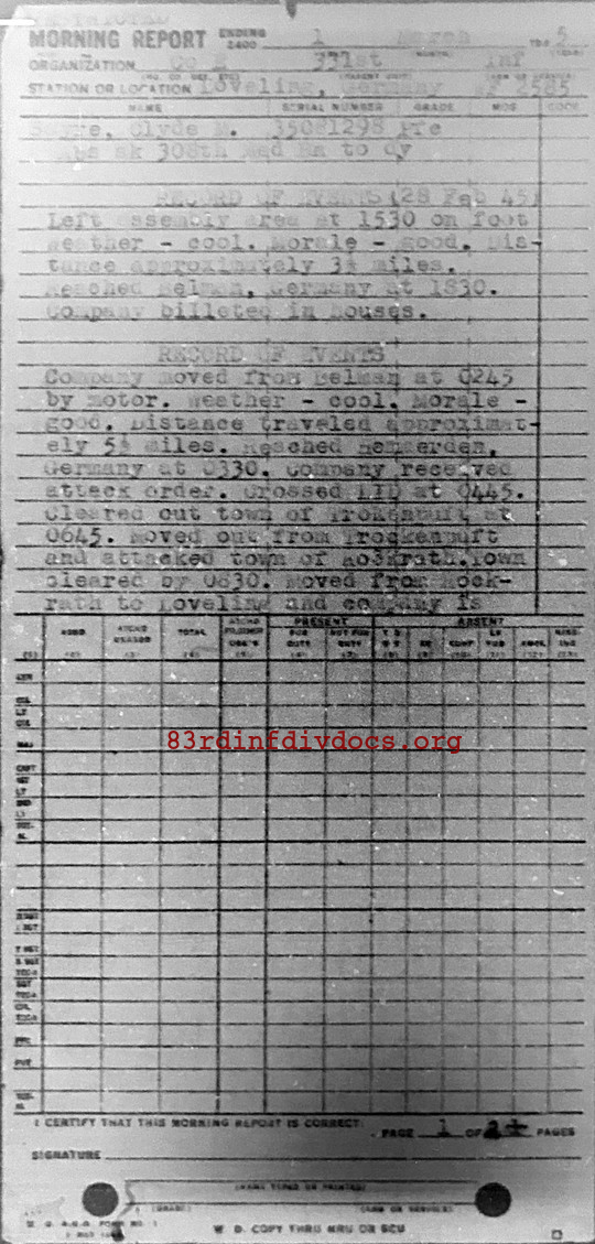Company moved from Belman at 0245 by motor. Weather - cool. Morale - good. Distance traveled approximately 5 1/2 miles. Reached Hemmerden, Germany at 0330. Company received attack order. Crossed LID at 0445. Cleared out town of Trockenpuft at 0645. Moved out from Trockenpuft and attacked town of Rockrath. Town cleared by 0830. Moved from Rokrath to Loveling and company is outposting town of Loveling. Total prisoners captured 19 (18 EM - 1 Off). Casualties extremely light. Resistance light.
