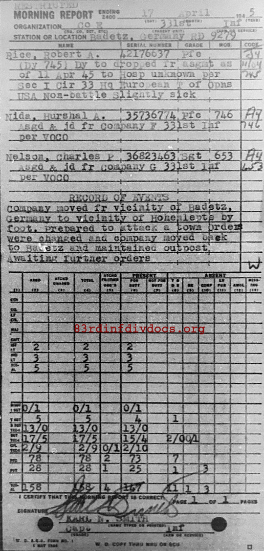 Company moved fr vicinity of Badetz, Germany to vicinity of Hohenlepte by foot. Prepared to attack a town. Orders were changed and company moved back to Badetz and maintained outpost. Awaiting further orders.