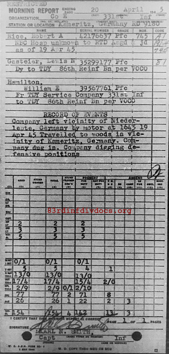 Company left vicinity of Niederlepte, Germany by motor at 1645 19 Apr 45. Travelled to woods in vicinity of Kameritz, Germany. Company dug in. Company digging defensive positions.