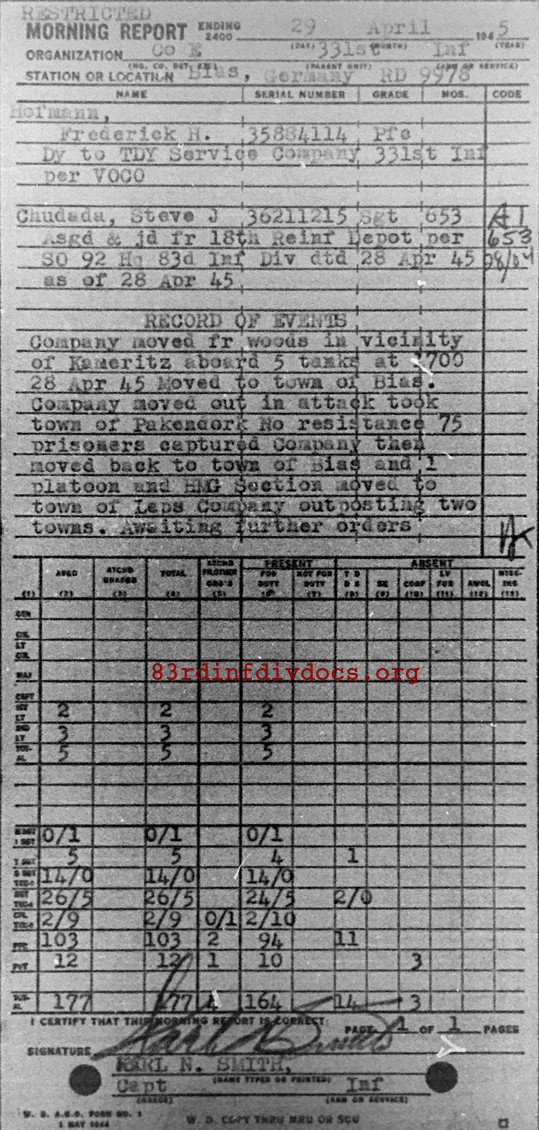 Company moved fr woods in vicinity of Kameritz aboard 5 tanks at 1700 28 Apr 45 Moved to town of Bias. Company moved out in attack took town of Pakenoork. No resistance 75 prisoners capture. Company then moved back to town of Bias and 1 platoon and HMG Section moved to town of Leps. Company outposting two towns. Awaiting further orders.
