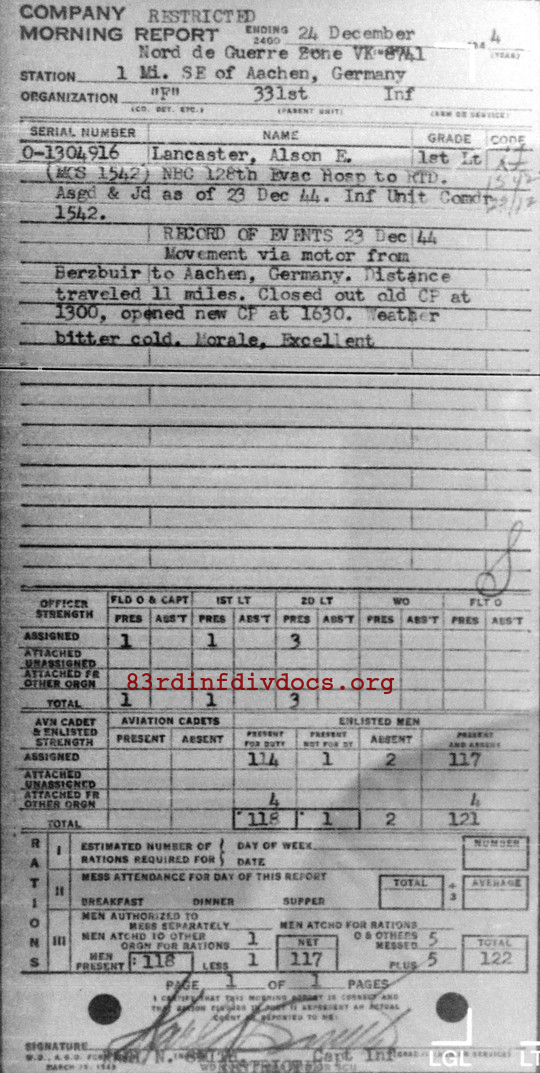 Movement via motor from Berzbuir to Aachen, Germany. Distance traveled 11 miles. Closed old CP at 1300, opened new CP at 1630. Weather bitter cold. Morale, excellent.