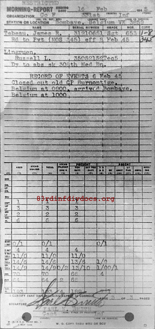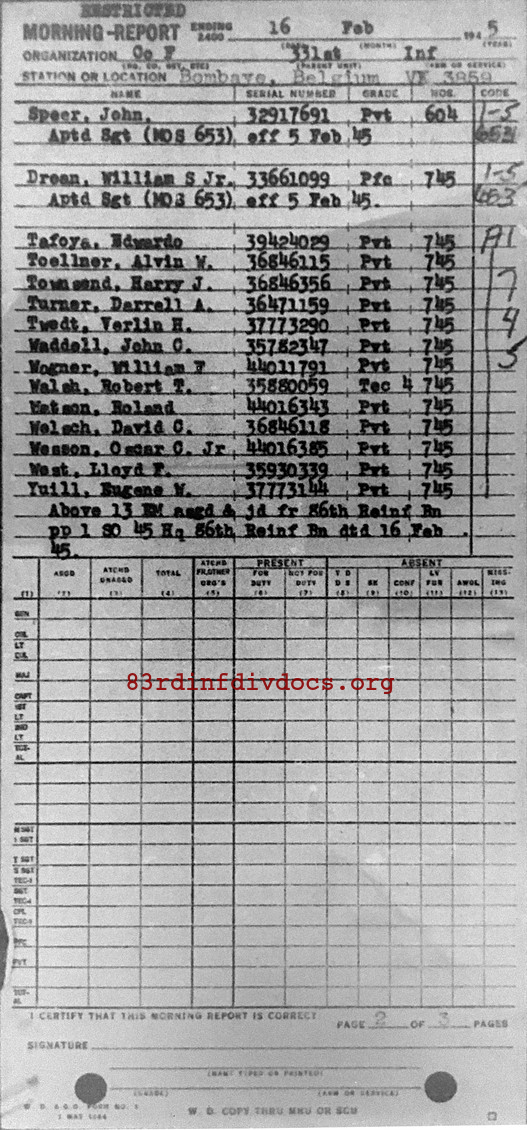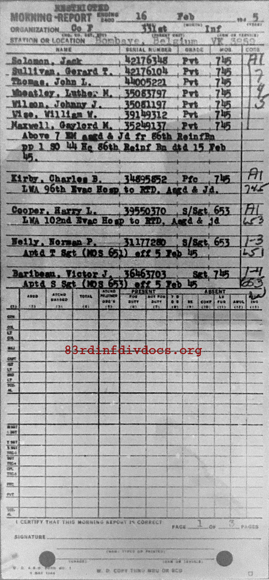 Morning report F/331 for February 16, 1945