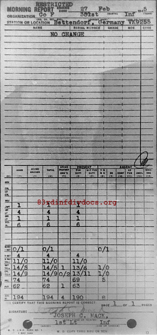 Morning report F/331 for February 27, 1945