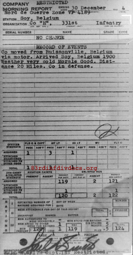 Co moved from Buissonville, Belgium via motor. Arrived Soy, Belgium 1900. Weather very cold. Morale good. Distance 20 miles. Co in defense.