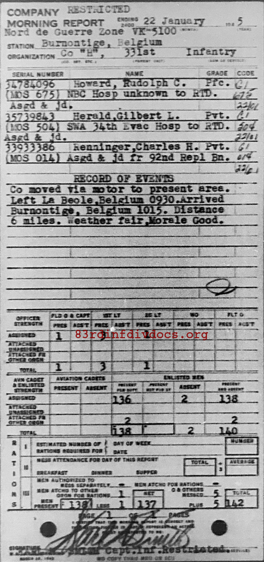 Co moved via motor to present area. Left La Beole, Belgium 0930. Arrived Burnontige, Belgium 1015. Distance 6 miles. Weather fair. Morale Good.