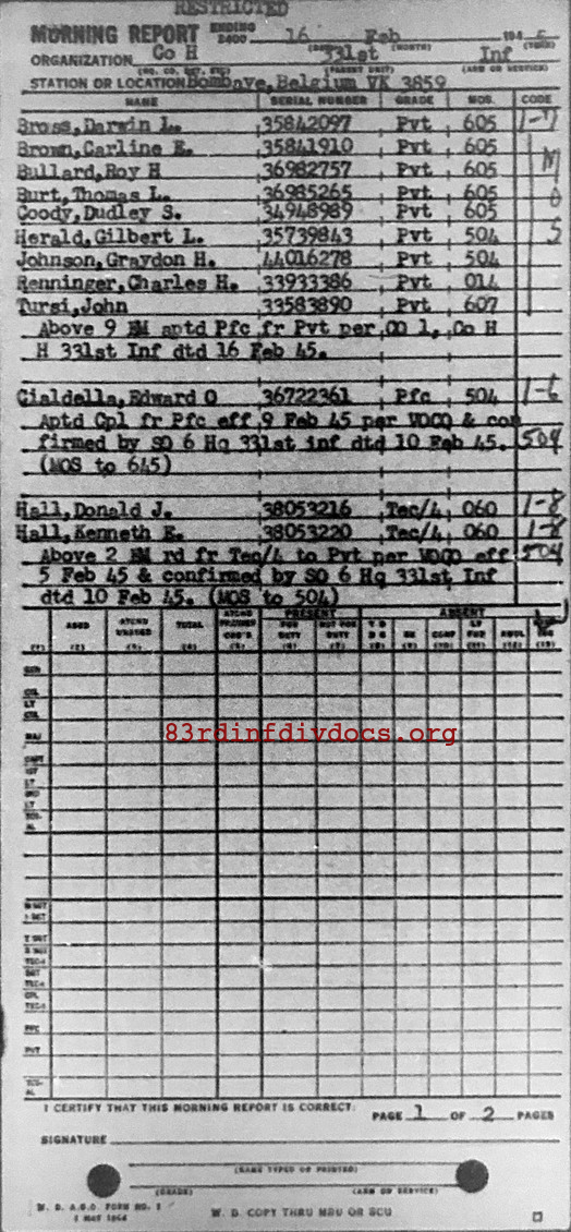Co moved fr Burnontige, Belgium via motor convoy. Arrived Bombay, Belgium 6 Feb 45.