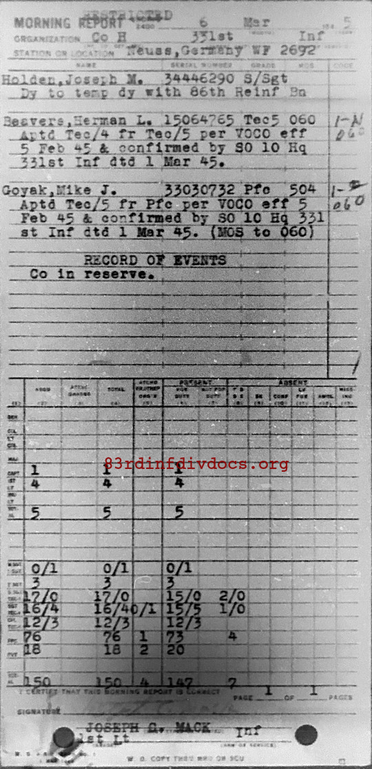 Morning report H/331 for March 6, 1945