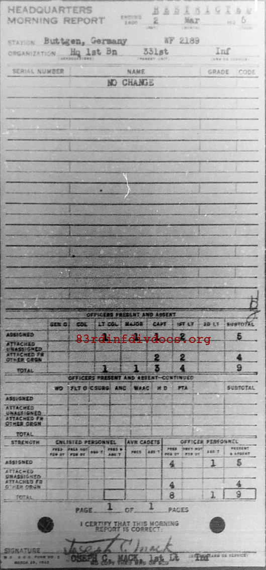 Morning report HQ1BN/331 for March 2, 1945