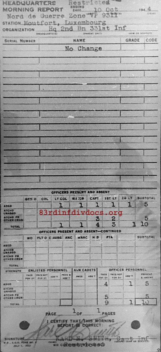 Morning report HQ2BN/331 for October 10, 1944