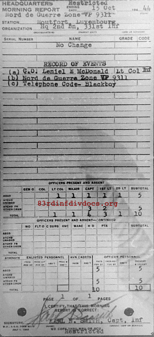 (a) CO Leniel E McDonald Lt Col Inf (b) Nord de Guerre Zone VP 9311 (c) Telephone Code- Blackboy