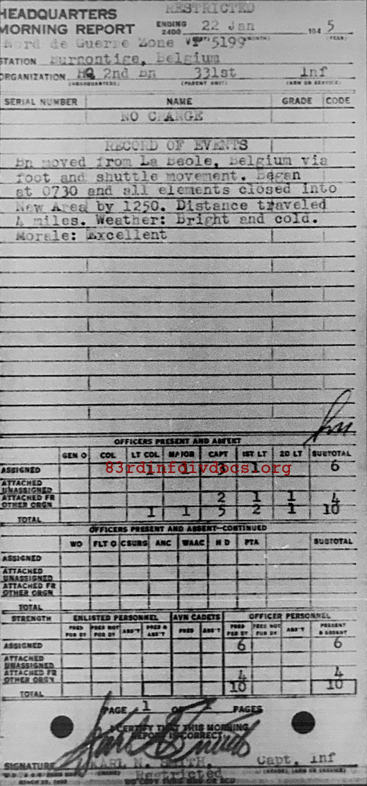 Bn moved from La Beole, Belgium via foot and shuttle movement. Began at 0730 and all elements closed into New Area by 1250. Distance traveled 4 miles. Weather: Bright and cold. Morale: Excellent.