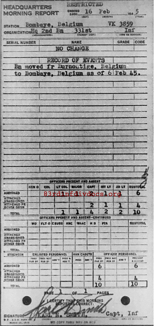 Morning report HQ2BN/331 for February 16, 1945