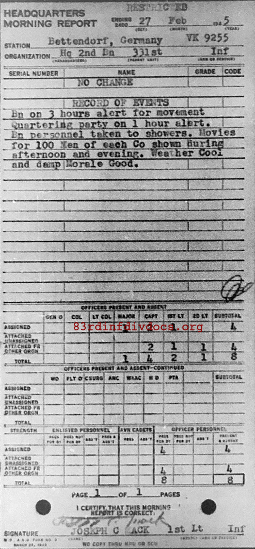Morning report HQ2BN/331 for February 27, 1945