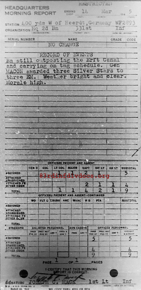 Bn still outposting the Erft Canal and carrying on tng schedule. Gen Macon awarded three Silver Stars to three EM. Weather bright and clear. Morale high.