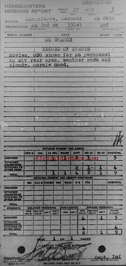 Movies, USO shows for Bn personnel in Div rear area. Weather warm and cloudy. Morale Good.