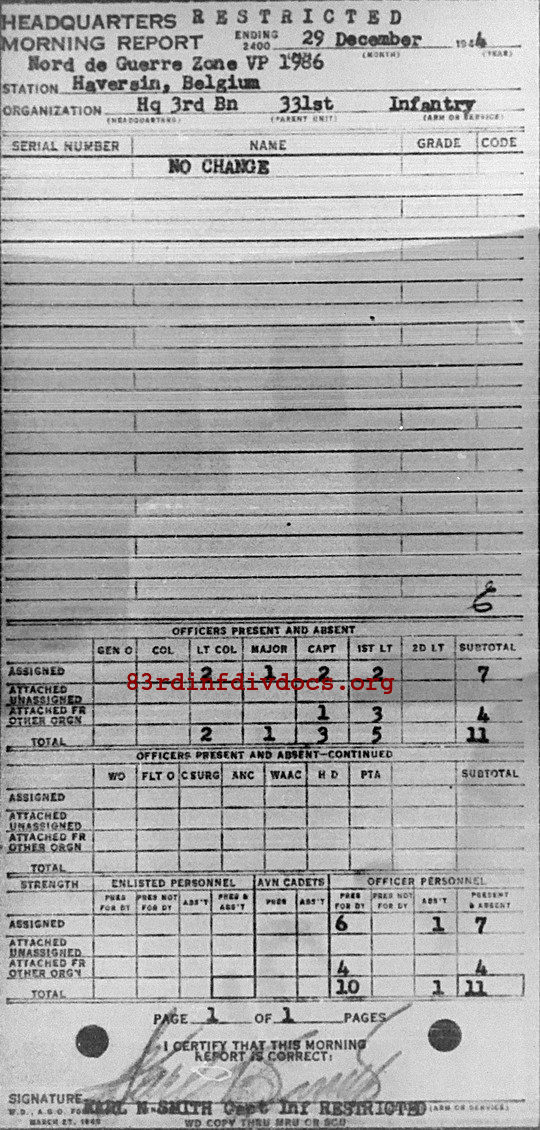 Morning report HQ3BN/331 for December 29, 1944
