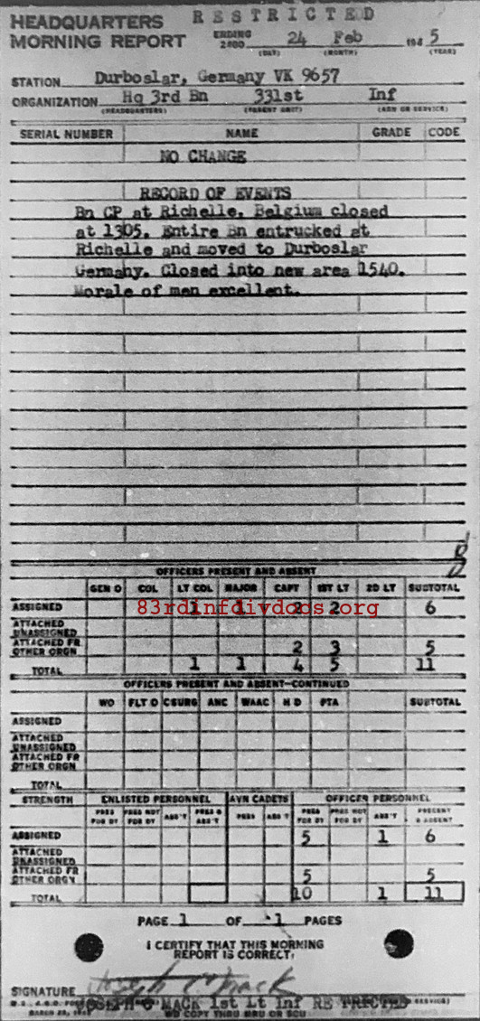 Morning report HQ3BN/331 for February 24, 1945