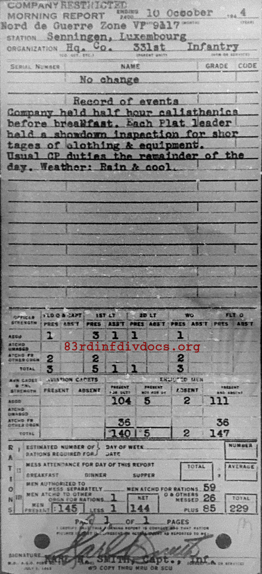 Company held half hour calisthenics before breakfast. Each Plat leader held a showdown inspection for shortages of clothing and equipment. Usual CP duties in the remainder of the day. Weather: Rain and cool.