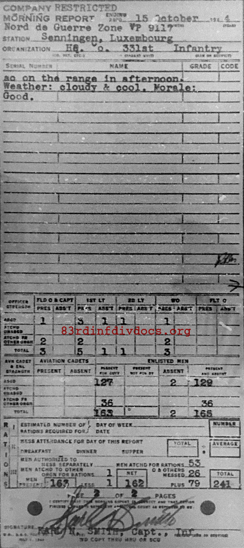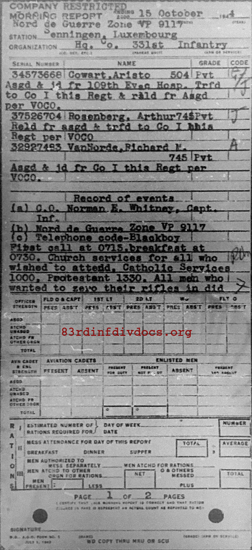 (a) C.O. Norman E. Whitney, Capt Inf (b) Nord de Guerre Zone VP 9117 (c) Telephone code Blackboy. First call at 0715, breakfast at 0730. Church services for all who wished to attend. Catholic services at 1000. Protestant 1330. All men who wanted to zero their rifles in did so at the range in the afternoon. Weather: cloudy and cool. Morale: Good.
