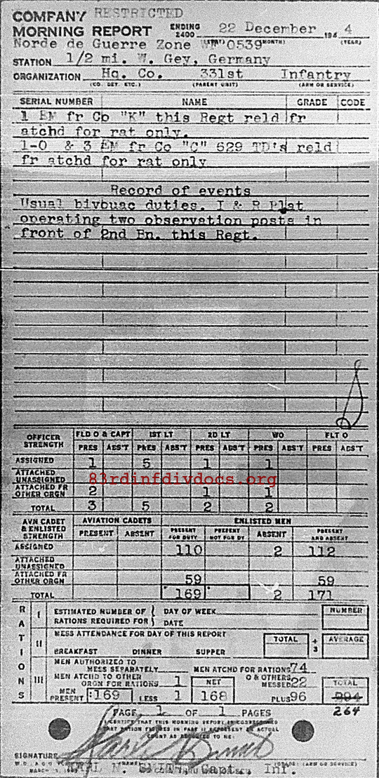 Morning report HQCO/331 for December 22, 1944