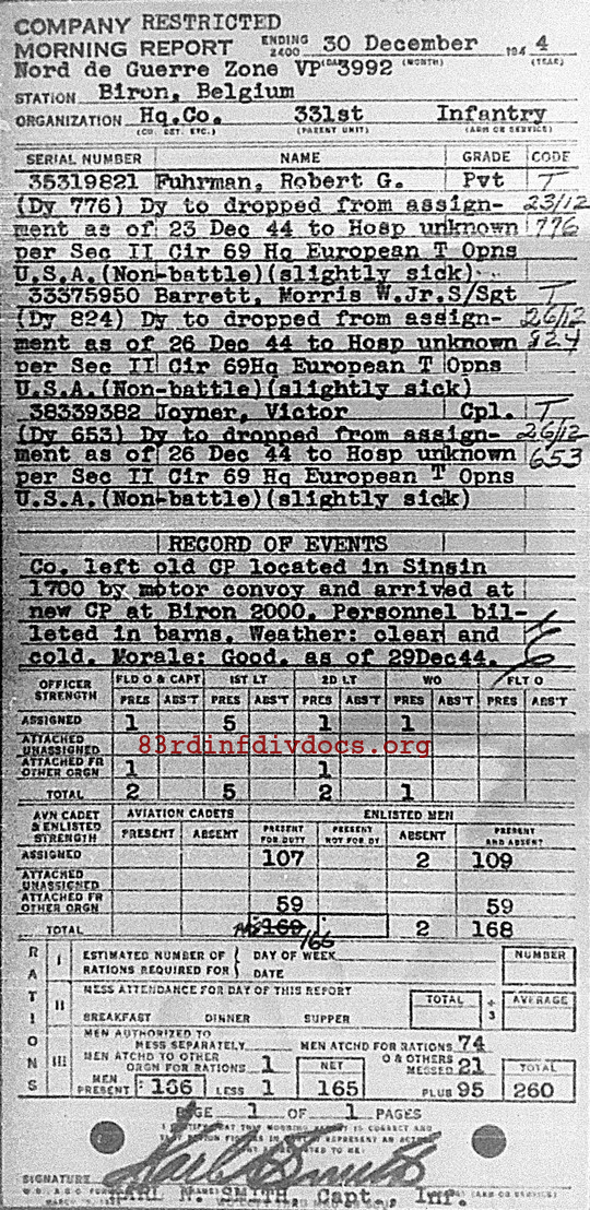 Morning report HQCO/331 for December 30, 1944