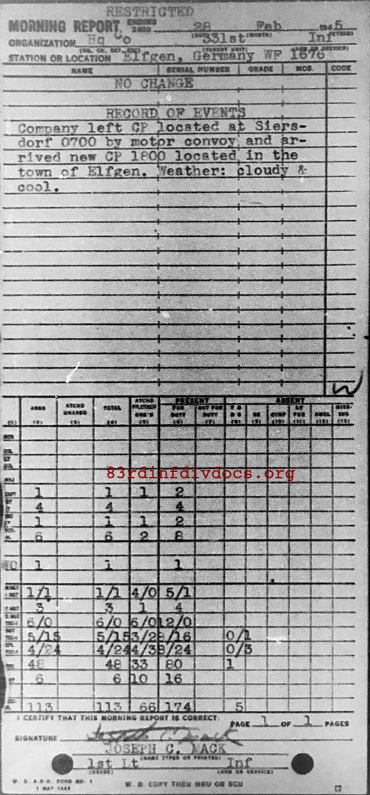 Company left CP located at Siersdorf 0700 by motor convoy and arrived new CP 1800 located in the town of Elfgen. Weather cloudy and cool.