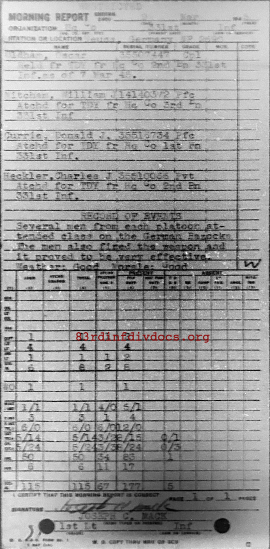 Several men from each platoon attended class on the German Bazooka. The men also fired the weapon and it proved to be very effective. Weather: Good. Morale: Good.