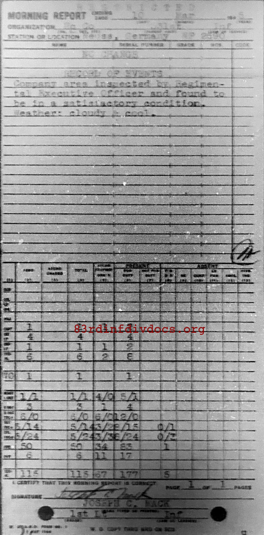 Company area inspected by Regimental Executive Officer and found to be in a satisfactory condition. Weather: cloudy and cool.