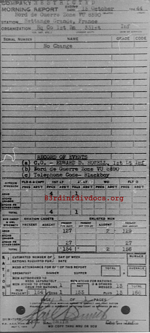 Morning report HQCO1BN/331 for October 15, 1944