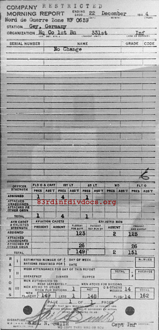 Morning report HQCO1BN/331 for December 22, 1944