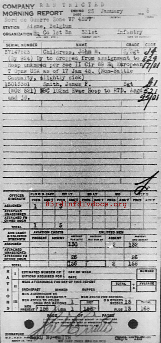Morning report HQCO1BN/331 for January 25, 1945