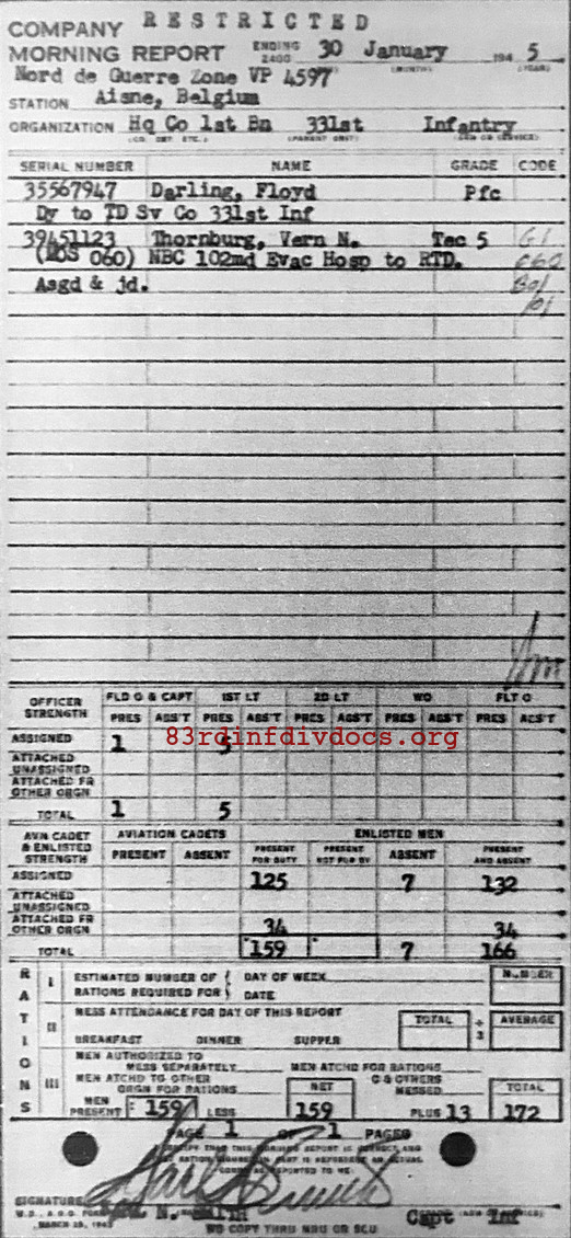 Morning report HQCO1BN/331 for January 30, 1945