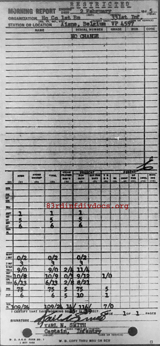 Morning report HQCO1BN/331 for February 2, 1945