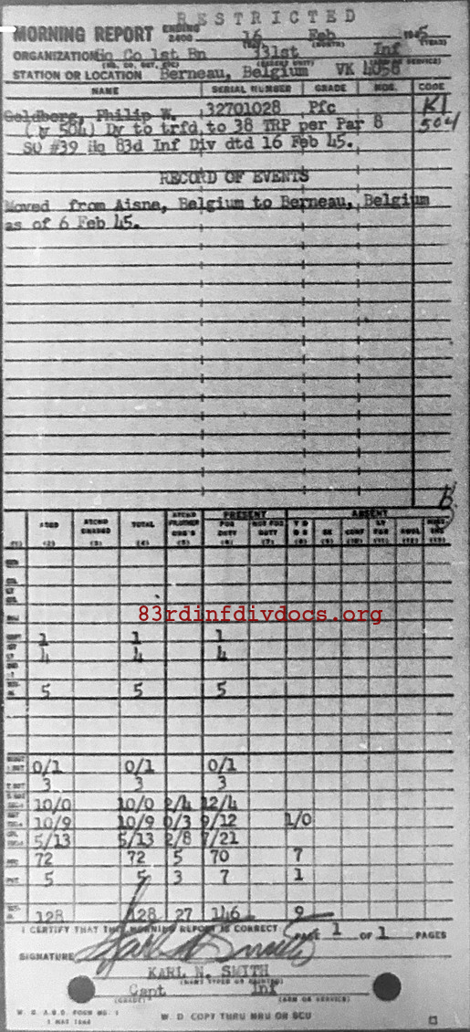 Morning report HQCO1BN/331 for February 16, 1945