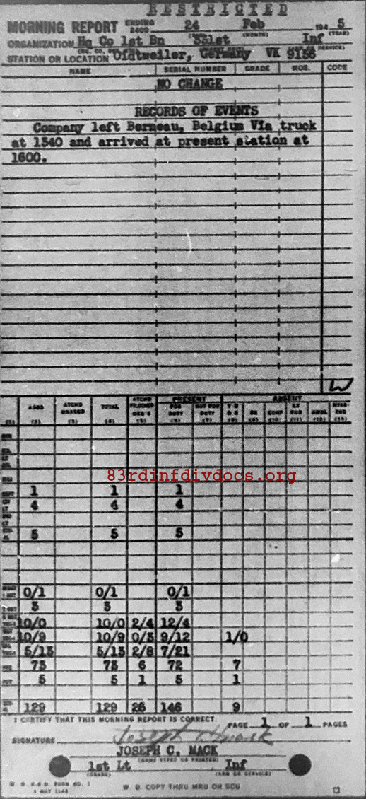 Morning report HQCO1BN/331 for February 24, 1945