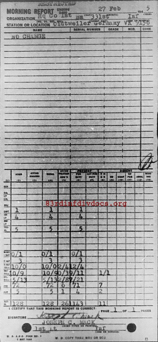 Morning report HQCO1BN/331 for February 27, 1945