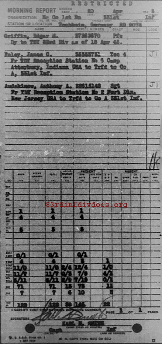 Morning report HQCO1BN/331 for April 20, 1945