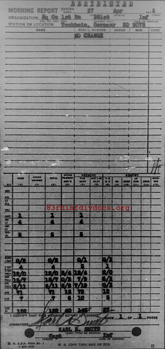 Morning report HQCO1BN/331 for April 27, 1945