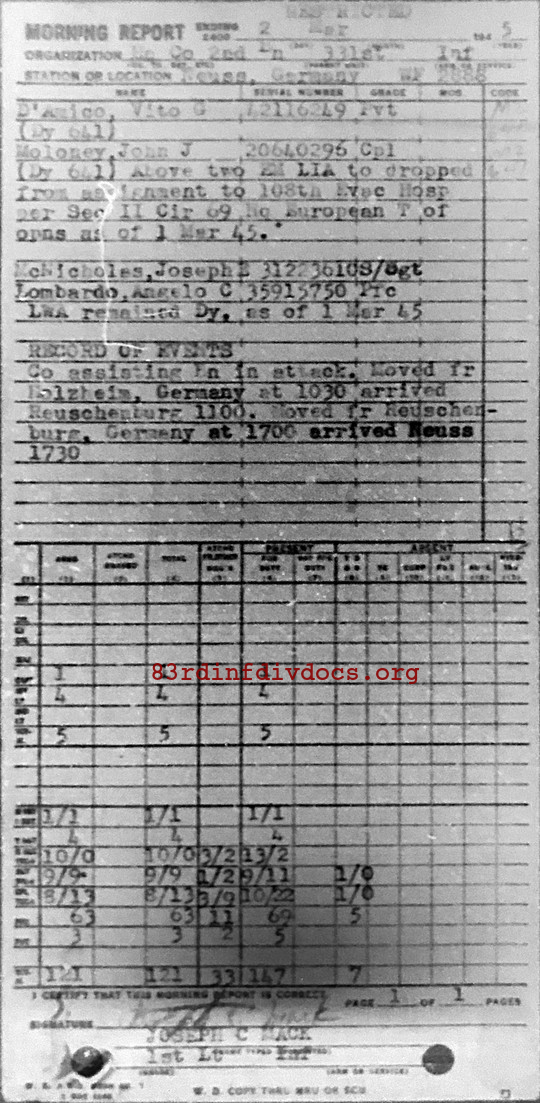 Co assisting Bn in attack. Moved fr Holzheim, Germany 1030 arrived Reuschenburg 1100. Moved fr Reuschenburg, Germany at 1700 arrived Neuss 1730.