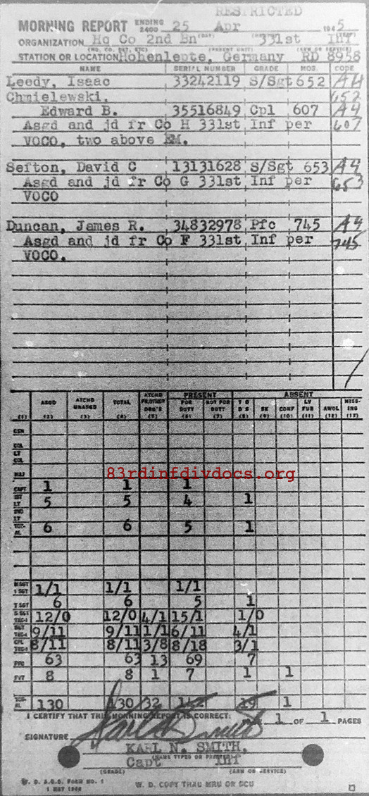Morning report HQCO2BN/331 for April 25, 1945