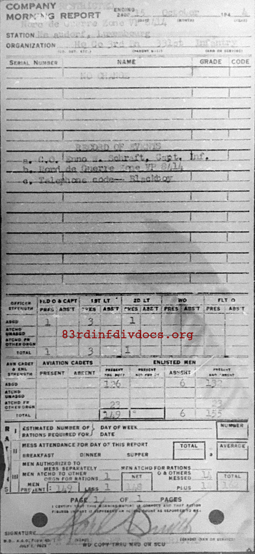 (a). CO Enno W Schraft, Capt Inf (b) Nord de Guerre Zone VP8414 (c) Telephone code -- Blackboy