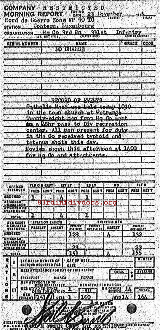 Catholic Mass was held today at 1030 in the town church of Oetrange. Twenty-eight men of Hq Co went on a 48hr pass to Div recreation center. All men present for duty in the Co received typhoid and tetanus shots this day. Movies shown this afternoon at 1400 for Hq Co and attachments.