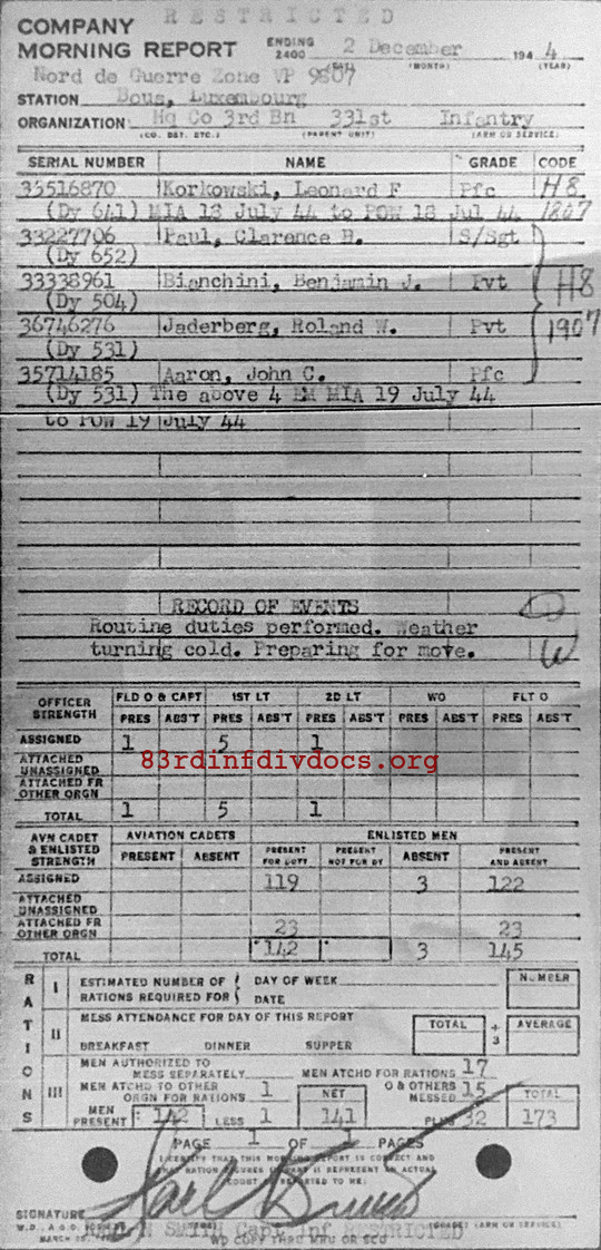 Morning report HQCO3BN/331 for December 2, 1944