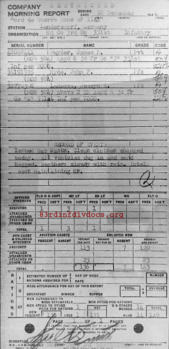 Issued Gas Masks. Clean clothes changed today. All vehicles dug in and sand bagged. Weather: cloudy with rain. Intel sect maintaining OP.