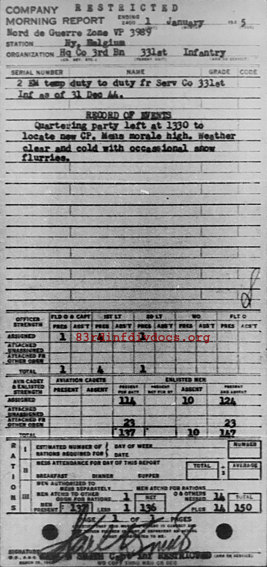 Quartering party left at 1330 to locate new CP. Mens morale high. Weather clear and cold with occassional snow flurries.