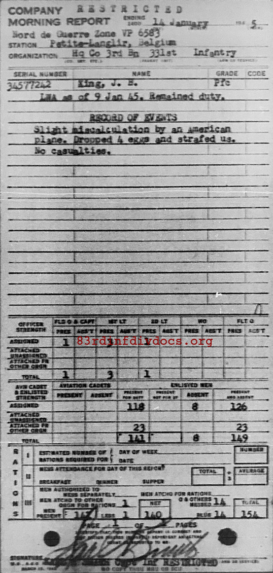 Slight miscalculation by an American plane. Dropped 4 eggs and strafed us. No casualties.