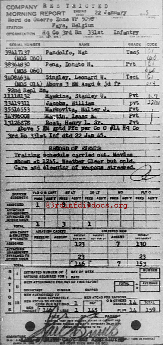 Morning report HQCO3BN/331 for January 22, 1945