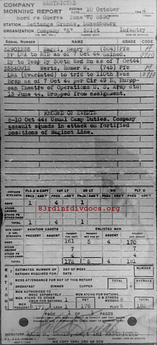 8-10 Oct 44: Usual Camp Duties. Company assault squads in attack on fortified positions of Maginot Line.
