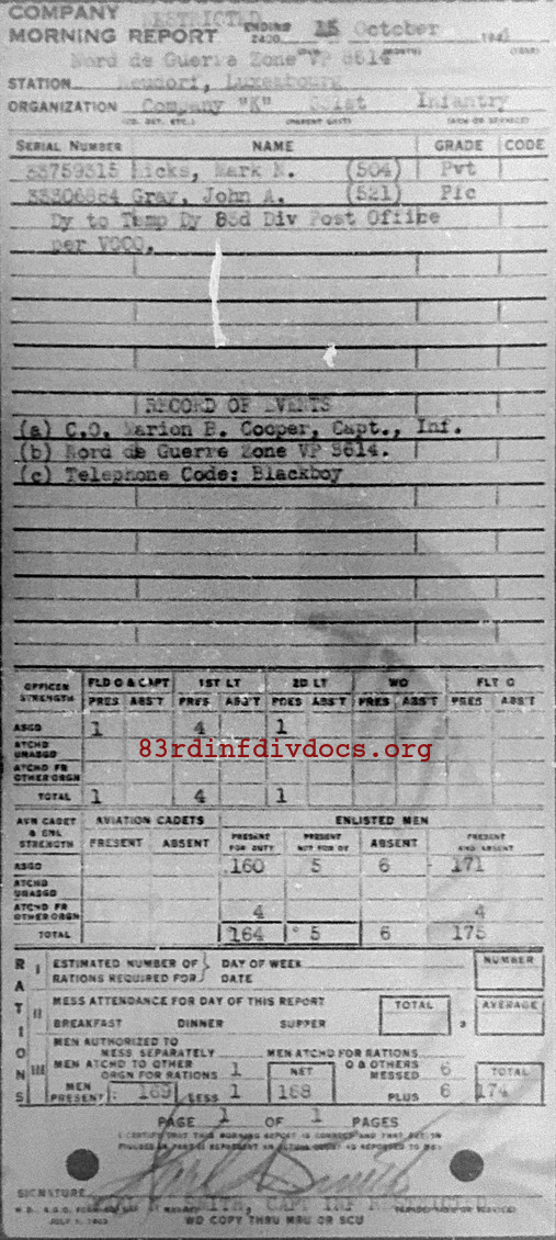 (a) C.O. Marion B. Cooper, Capt. Inf. (b) Nord de Guerre Zone VP8614. (c) Telephone Code: Blackboy
