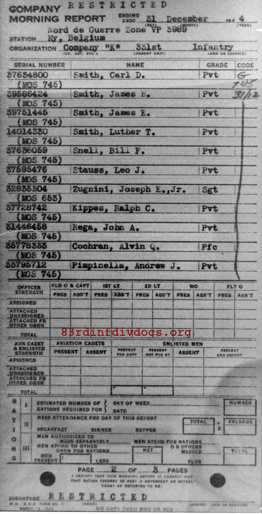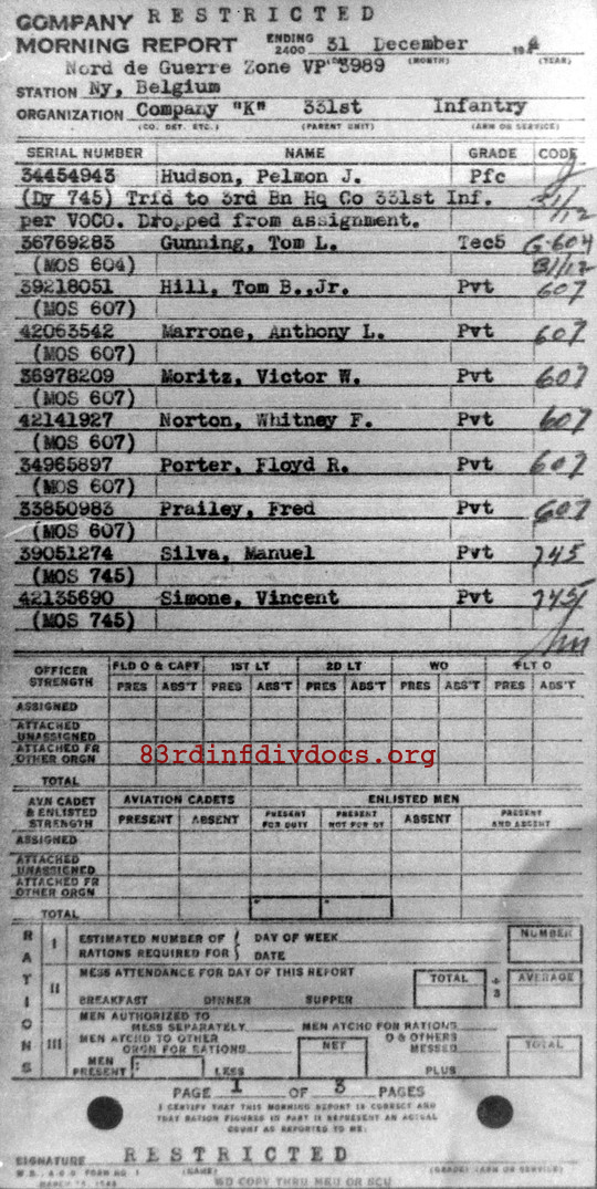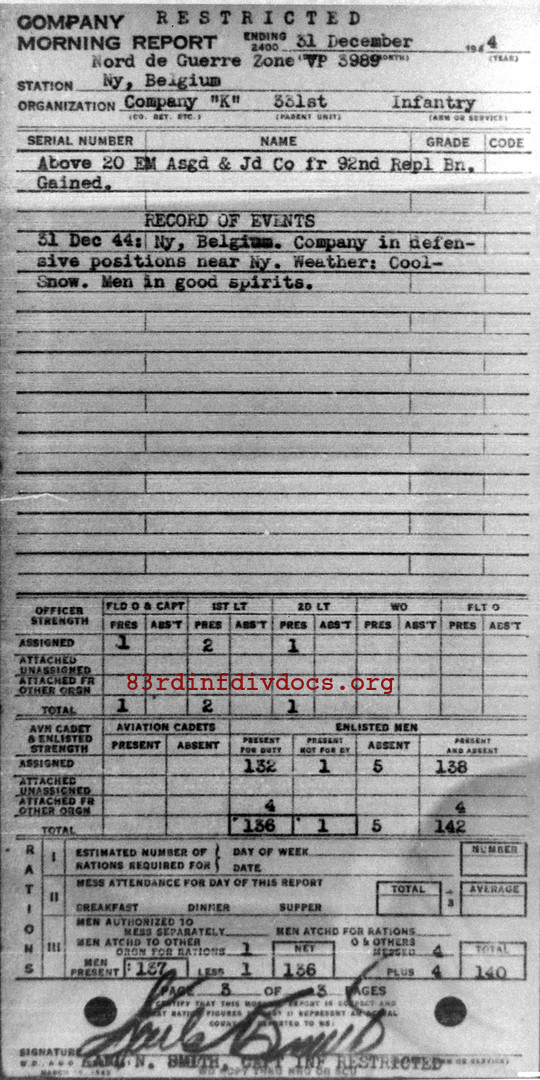 31 Dec 44: Ny, Belgium. Company in defensive positions near Ny. Weather: Cool-Snow. Men in good spirits.